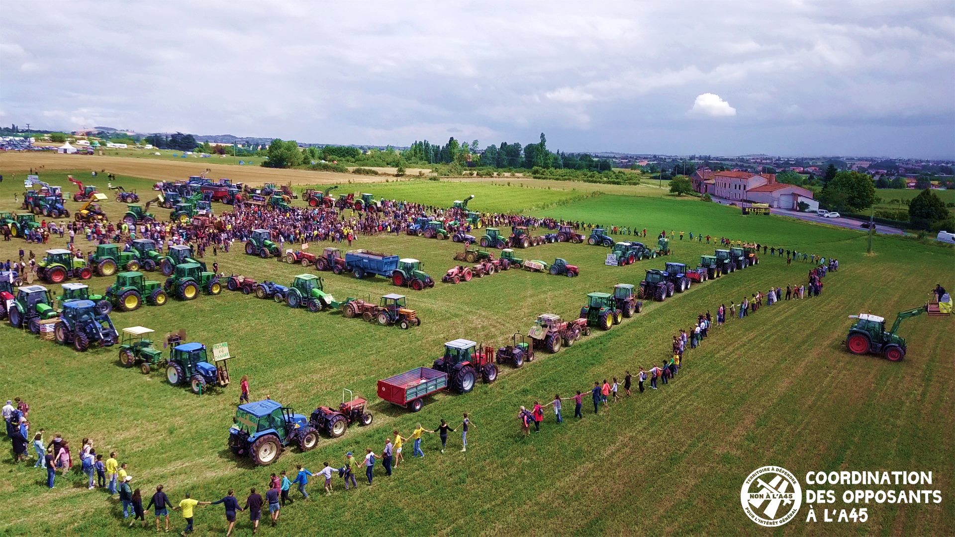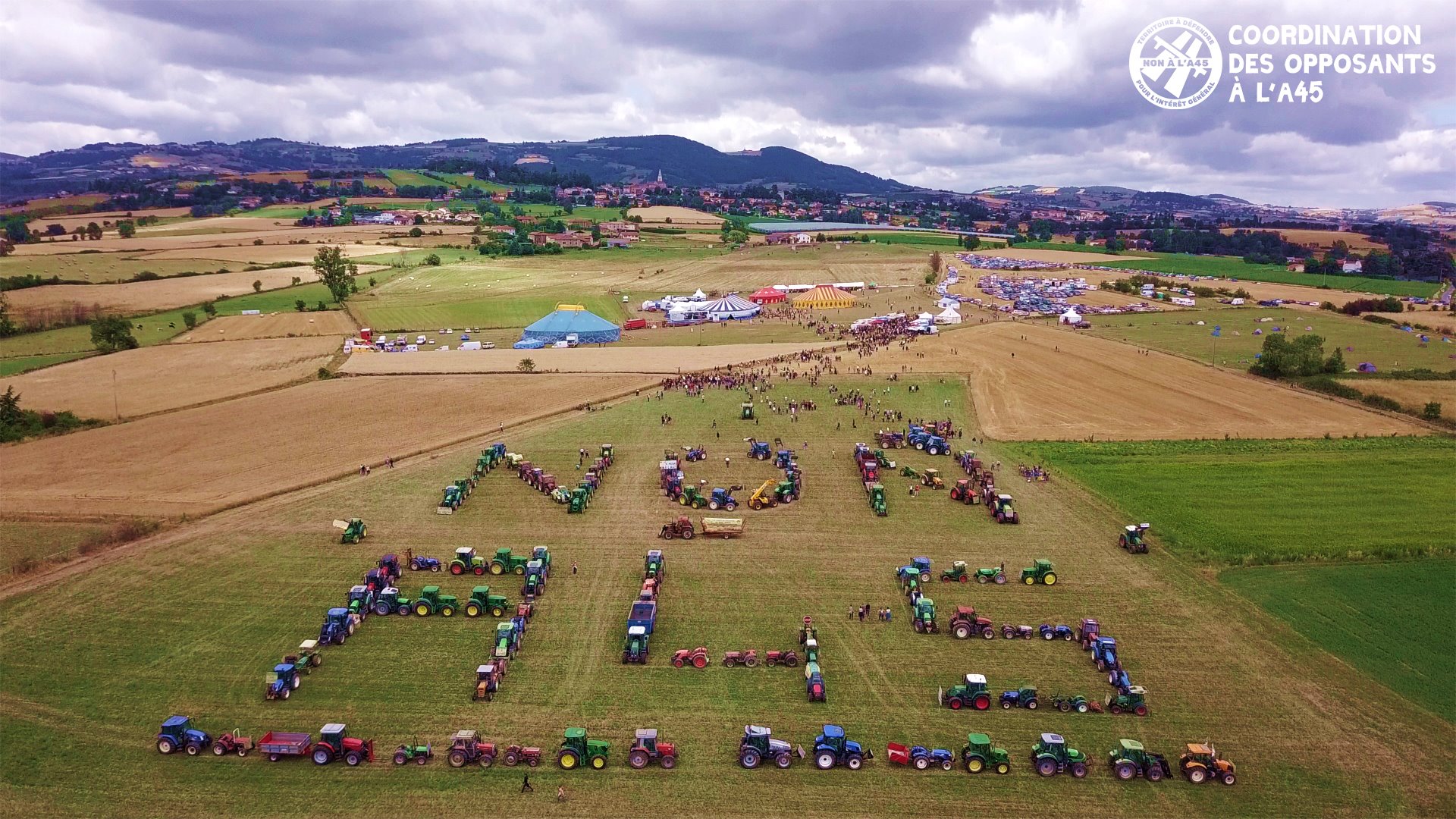 Plus de 130 tracteurs ont participé au message géant dessiné sur un des champs impactés par le projet : NON A45 !